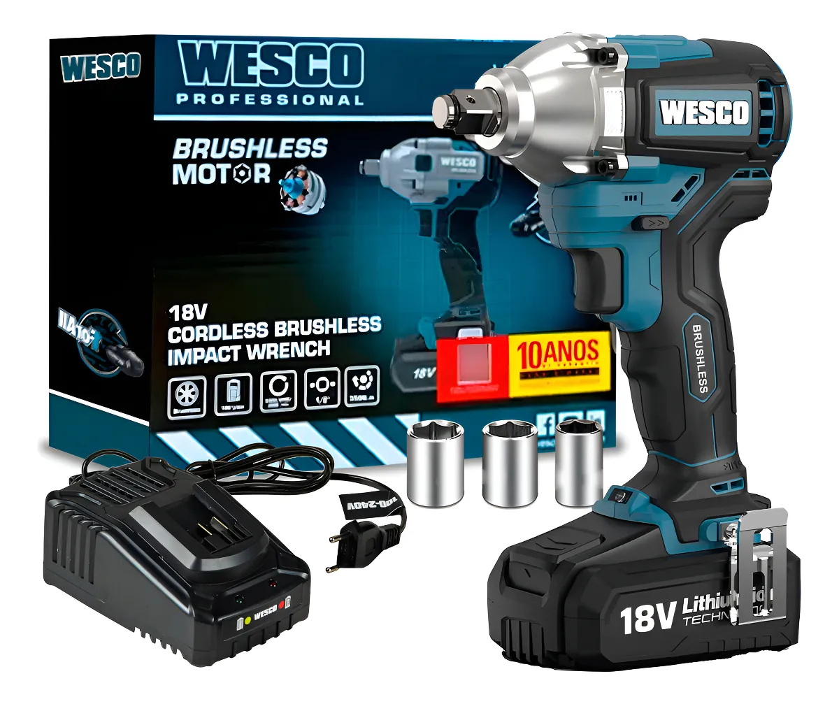 A chave de impacto Wesco WS2407.9 oferece alto torque, tecnologia brushless e desempenho superior para apertos e desapertos pesados. Com 350 Nm de força, é indicada para uso profissional em mecânica, manutenção, construção e operações que exigem potência com total mobilidade. Compacta, robusta e eficiente, entrega excelente autonomia e durabilidade graças ao motor sem escovas.